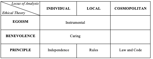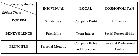 Accanto al proliferare di ipotesi che vedevano il clima etico come un insieme di azioni giuste, o sbagliate, messe in atto dai lavoratori e dall’azienda stessa (Mayer et al., 2010), Victor e Cullen (1988) offrirono una prima tassonomia dei possibili climi etici rintracciabili nelle organizzazioni, differenziandoli sulla base della qualità delle percezioni e non solamente sulla quantità delle azioni. Basandosi su alcuni principi della filosofia morale applicati alla vita organizzativa, l’analisi condotta dagli studiosi comprendeva l’intersezione di due dimensioni fondamentali per la gestione delle dinamiche interne alle aziende. Da un lato, vi erano i criteri etici (Principio, Benevolenza, Egoismo) considerati per prendere le decisioni e, dall’altro, i loci di analisi (Individuale, Locale, Cosmopolita) che definivano l’area dell’intervento manageriale (Figura 1).