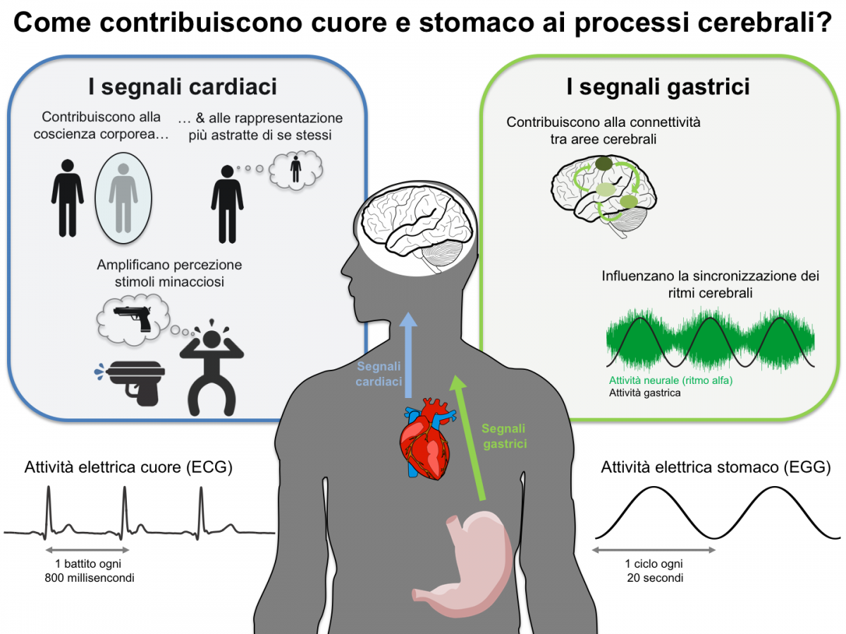 Il cuore si contrae ritmicamente (circa ogni 800 millisecondi, come visibile dal tracciato di elettrocardiografia in basso a sinistra) e ad ogni contrazione invia dei segnali al cervello. Raggiungendo il cervello, le informazioni cardiache contribuiscono a vari processi cognitivi: esse amplificano la percezione di stimoli minacciosi, contribuiscono alla percezione del nostro corpo (coscienza corporea), e forniscono una base biologica alle rappresentazioni più astratte di noi stessi. I ritmi gastrici, più lenti di quelli cardiaci (un ciclo ogni 20 secondi), strutturano l’interazione di diverse aree cerebrali influenzandone anche la loro attività spontanea.