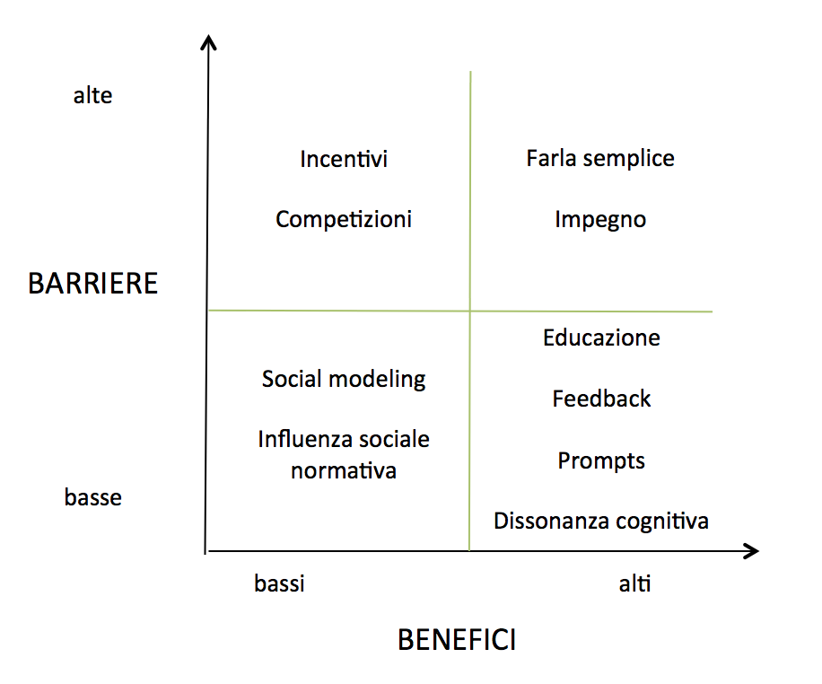 Figura 2. Framework a due dimensioni (barriere vs. benefici) proposto nel Community-Based Social Marketing (fonte: Schultz, 2015).