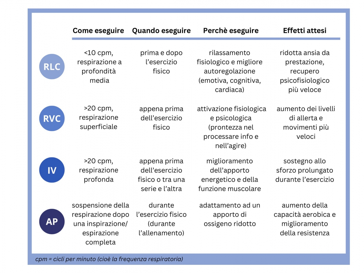 Figura 3. Caratteristiche delle quattro principali tecniche di regolazione volontaria della respirazione (proprietà degli autori)