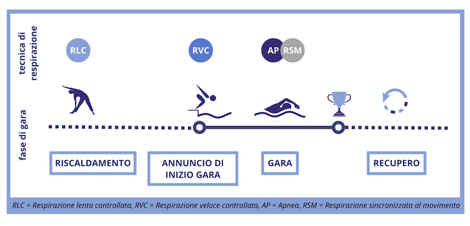 L'uso di una singola tecnica di respirazione, quando implementata in modo appropriato, può risultare vantaggioso per l’atleta a cui in gara è richiesto un alto livello di competitività, tuttavia l'uso mirato di una gamma di tecniche di respirazione può essere ancora più potente poiché l'atleta può adattare in modo flessibile la propria respirazione a seconda delle diverse esigenze della prestazione sportiva e delle necessità individuali. Nel caso menzionato prima, quello della nostra nuotatrice Emma, attingiamo all'esperienza di nuotatori e nuotatrici olimpici e paralimpici riguardo all'uso della respirazione modificata nei contesti di performance (Saint-Martin et al., 2020). I nuotatori e le nuotatrici hanno riferito, nel complesso, di avere utilizzato diverse tecniche di respirazione per migliorare le performance e regolare le emozioni. Risultava evidente la selezione intenzionale della tecnica, per l’implementazione delle condizioni psicofisiche ottimali, in base alle diverse esigenze in diversi momenti: "Durante il riscaldamento ho usato la respirazione lenta controllata, ma proprio prima dell'annuncio ho iniziato a fare respirazioni più veloci" (Saint-Martin et al., 2020, p. 3573). Inoltre l'apnea e la respirazione sincronizzata al movimento sono state utilizzate durante la gara di nuoto per supportare i movimenti ritmici richiesti dall’attività. Nello stile libero, ad esempio, i nuotatori e le nuotatrici possono abbinare l'inspirazione alle rotazioni del corpo e alternare i respiri a sinistra e destra per mantenere l'equilibrio.