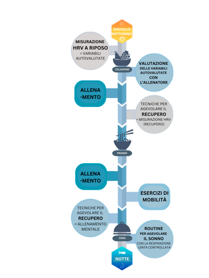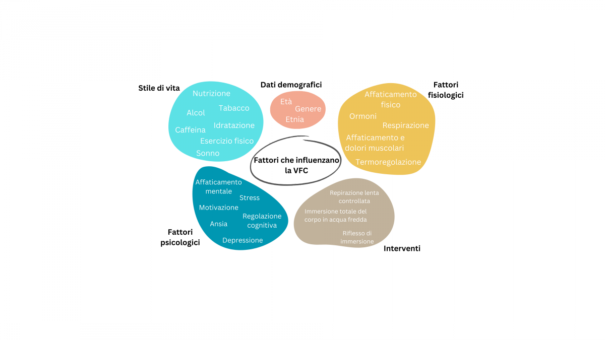 Per interpretare correttamente la VFC l’atleta dovrebbe misurarla in condizioni simili e alla stessa ora ogni giorno (Buchheit, 2014; Bellenger et al., 2016). Per ottenere letture accurate della VFC è quindi consigliabile raccogliere misurazioni al mattino prima di consumare cibo, o caffeina e prima di compiere attività fisica o sforzi mentali (Laborde et al., 2017). Una giornata tipica di allenamento utilizzando la misurazione della VFC è rappresentata nell'Immagine 1. Alcuni dei fattori più importanti che influenzano la VFC sono rappresentati nell'Immagine 2.